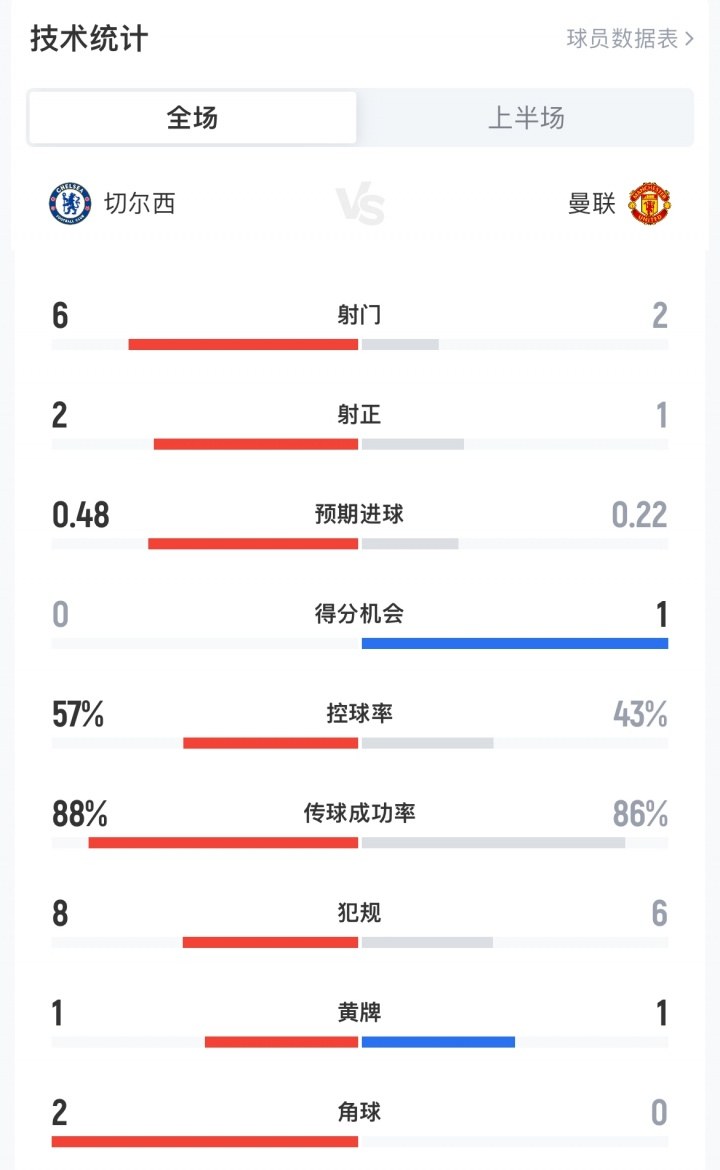 切尔西vs曼联半场交锋详报:蓝军进攻火力强 曼联效率高
