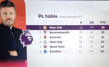 卡里克麾下曼联积分榜领跑,枪手曼城稍逊