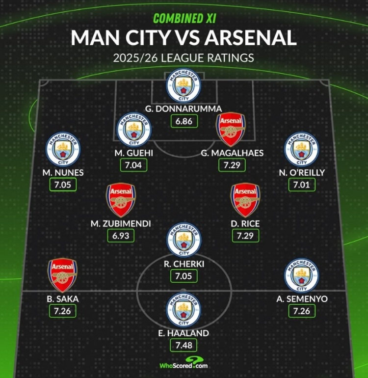Whoscored数据揭示英超本赛季最佳阵容:曼城7人入选,赖斯入围阿森纳
