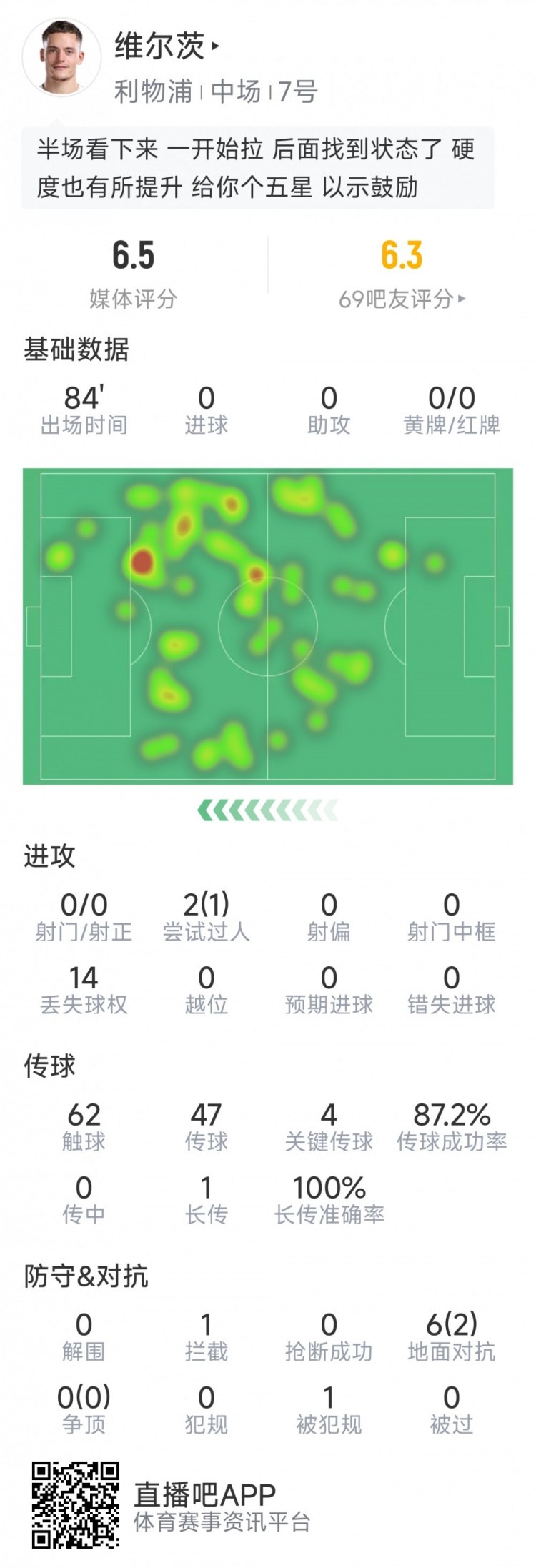 体育资讯4月19日发布:英超利物浦与埃弗顿的比赛里,维尔茨首秀登场。个人数据明细公示: