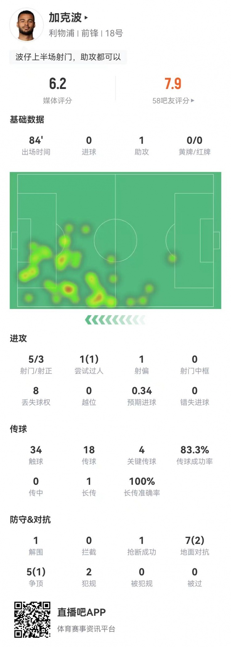 利物浦客场面对埃弗顿,加克波首发亮相贡献84分钟的数据亮点:1次助攻、4次关键传球,展现进攻穿透力。他的5次射门转化为3次射正,配合1次过人、1次抢断,但失去8次控球。技术层面,34次触球伴随18次传球(成功率83.3%),1次长传和1次解围也入账。在12次对抗中仅3次成功,伴随2次犯规,最终得到6.2分评分。