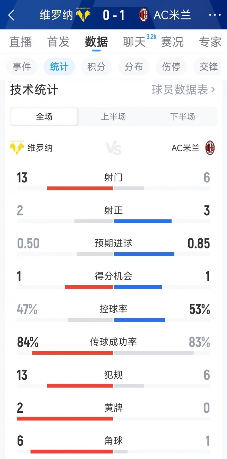 AC米兰技术统计:1-0战胜维罗纳,关键数据解析