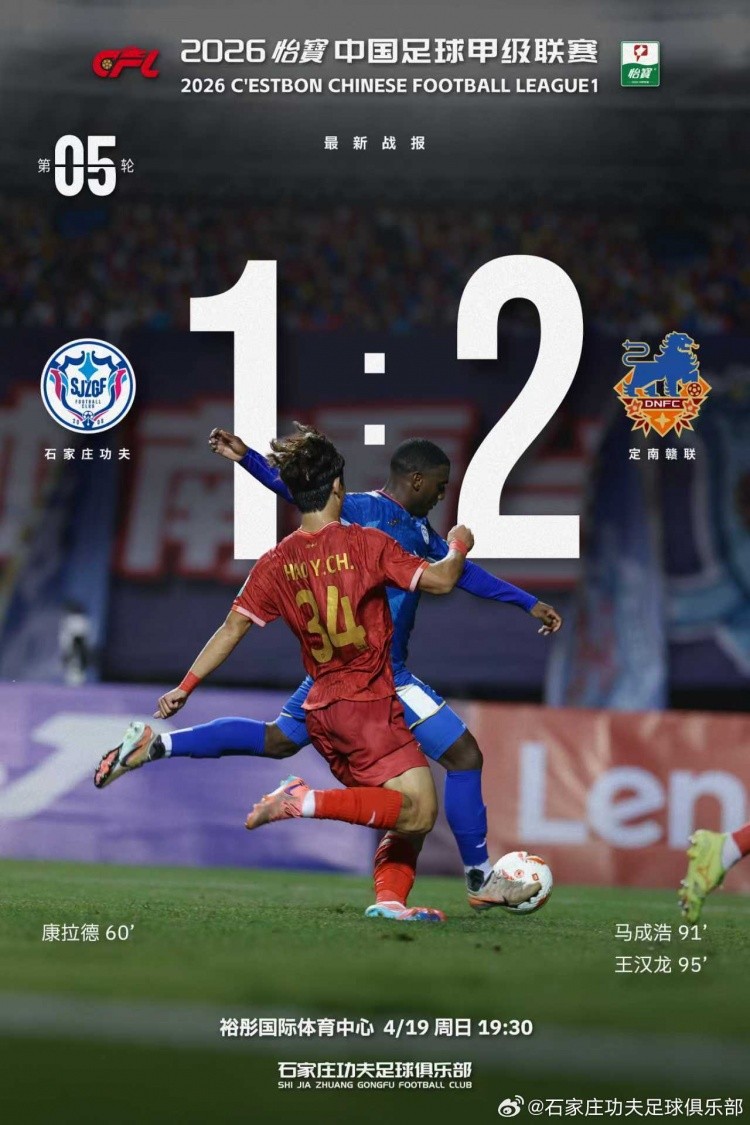 定南赣联2-1力克石家庄功夫,康拉德开启进球账户