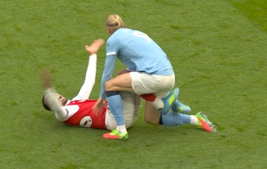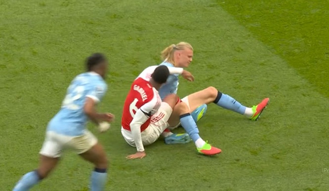比赛进行至第38分钟,哈兰德与加布里埃尔在争抢高空球时同时跌倒,两人自倒地至起身期间持续缠斗。