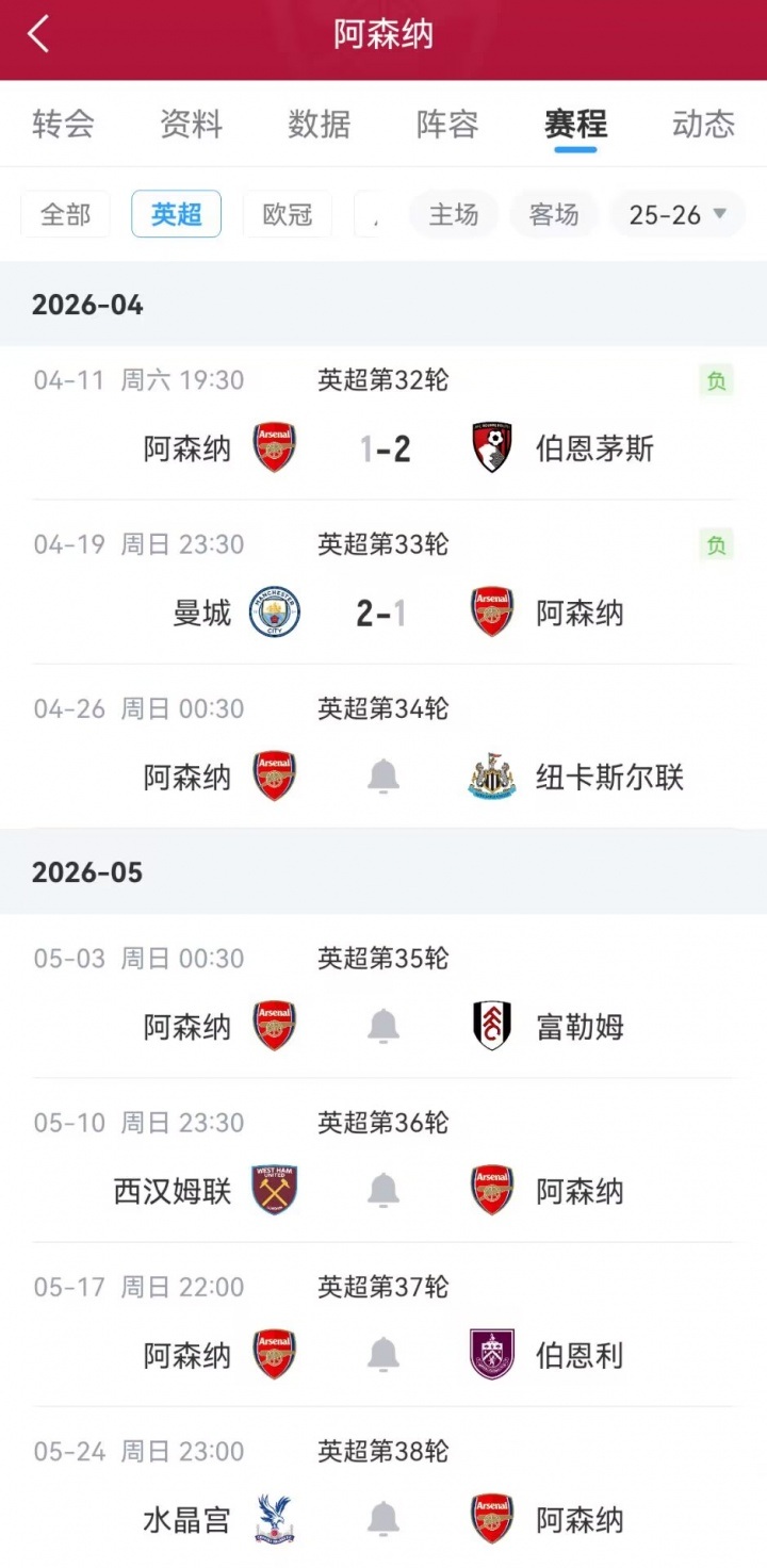 英超联赛第33轮,曼城2-1阿森纳,三分差距拉近至3分。阿森纳连续两轮未能取胜(负于伯恩茅斯和曼城),导致积分榜领先优势被大幅压缩。球队急需止住颓势,否则保级压力将加剧。
