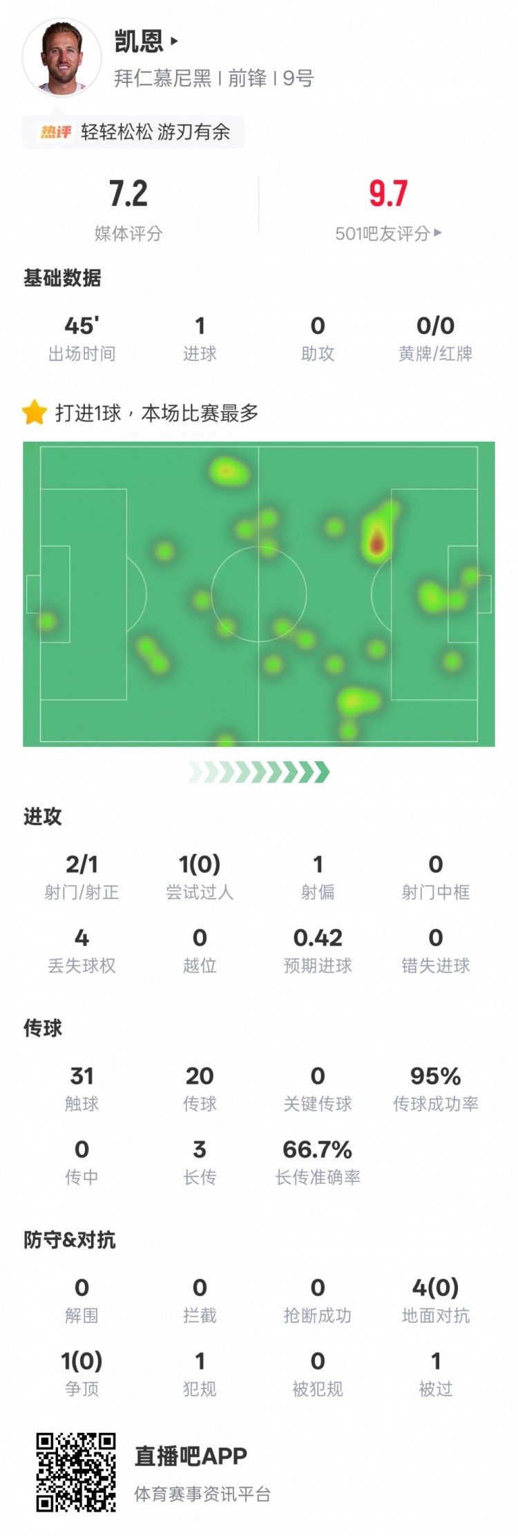 随着拜仁4-2击败斯图加特,提前4轮夺冠,凯恩替补登场的表现也受到关注。他在比赛中贡献1粒进球,2次射门均有效,传球成功率保持95%的顶尖水准,获得7.2分。以下是凯恩的详细数据:1进球,0助攻,2射门,1射正,1过人,0过人成功,1射偏,4丢球,31次触球,20次传球,95%传球成功率,3次长传,66.7%长传准确,4次地面对抗,0次成功,1次争顶,0次成功,1次犯规,1次被过。