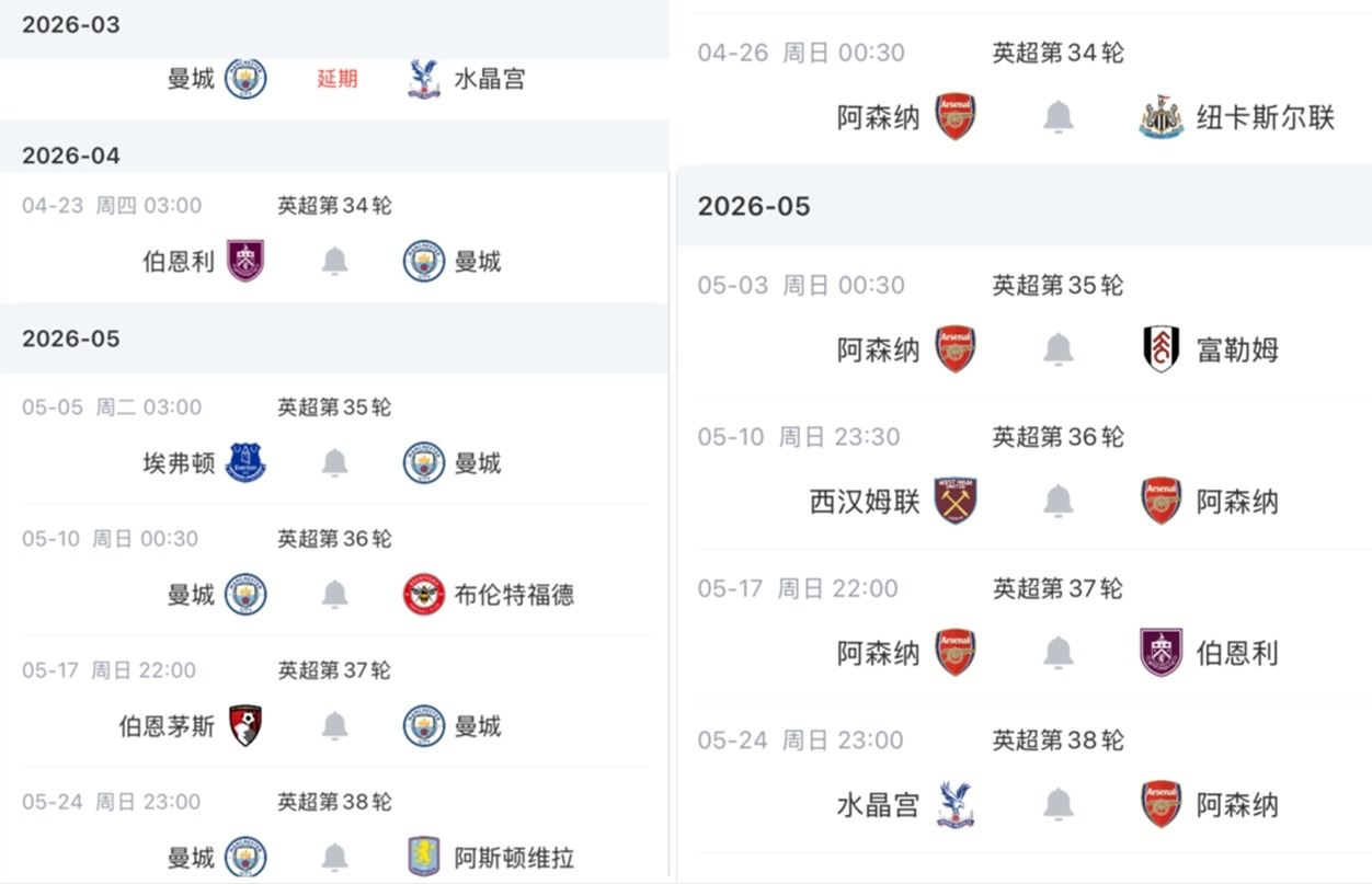 体育新闻4月20日报道,曼城在英超中战胜阿森纳,但少赛一场的劣势使其以3分落后。剩余赛程对比(见图)显示,枪手的争冠形势不容乐观,而曼城将与维拉展开关键对决,枪手则需迎战纽卡。