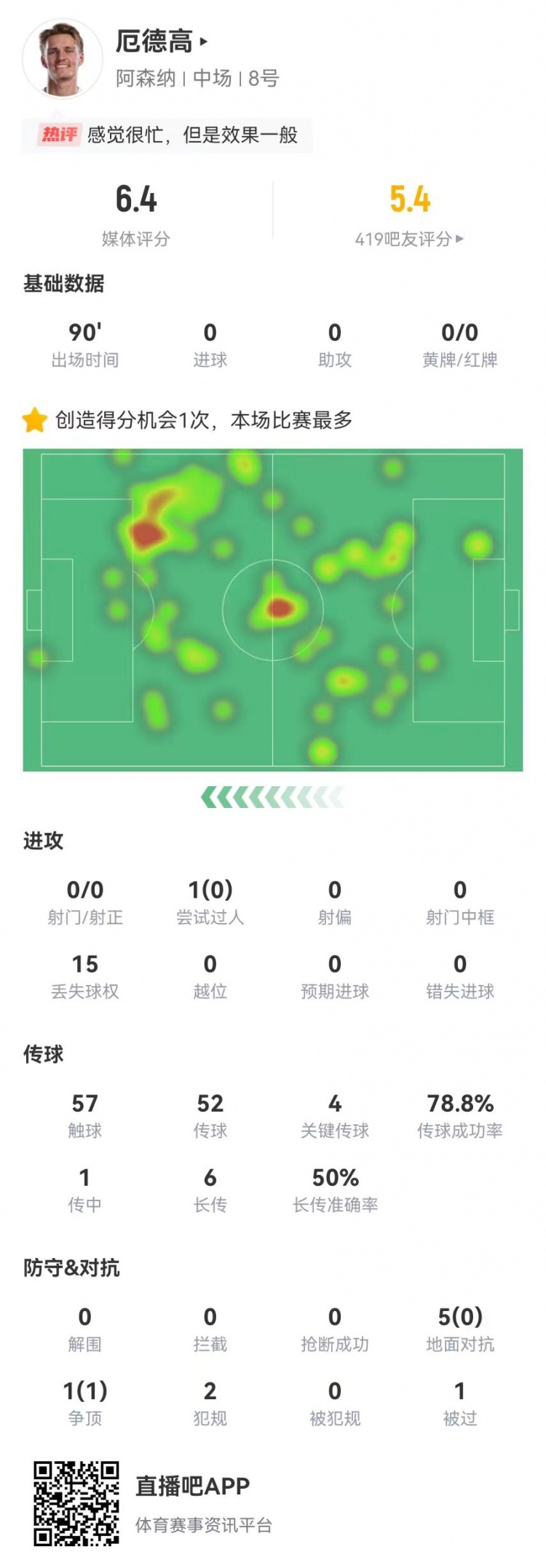 厄德高零射送4关键丢15球比赛数据