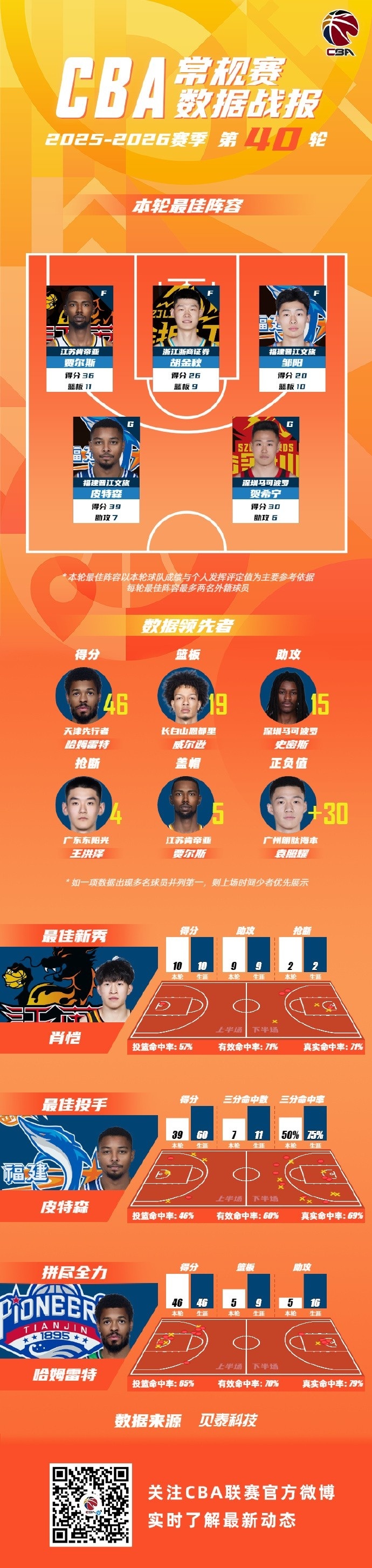 CBA官方公布第40轮最佳阵容,贾尔斯、胡金秋、邹阳、皮特森、贺希宁入选,分别代表江苏肯帝亚、浙江广厦、深圳新世纪、福建浔兴和浙江广厦。哈姆雷特46分领跑得分,威尔逊19篮板领跑篮板,史密斯15助攻领跑助攻,王洪泽4抢断领跑抢断,贾尔斯5盖帽领跑盖帽,袁照耀+30正负值领跑。肖恺获最佳新秀,皮特森获最佳投手,哈姆雷特获拼尽全力球员。