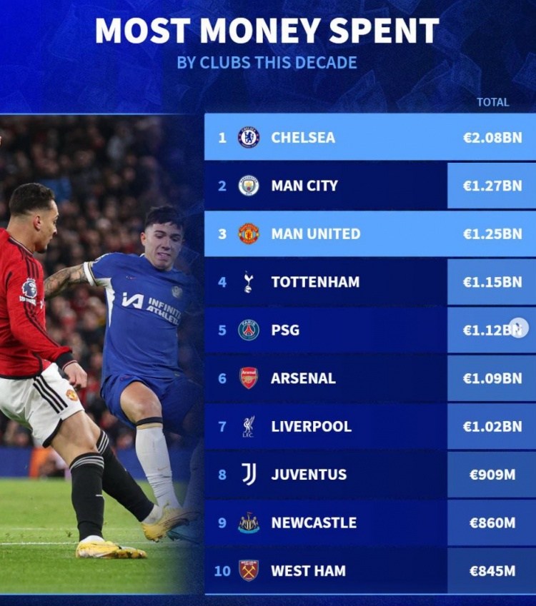 近7年转会花费TOP10:切尔西领衔,英超球队占优