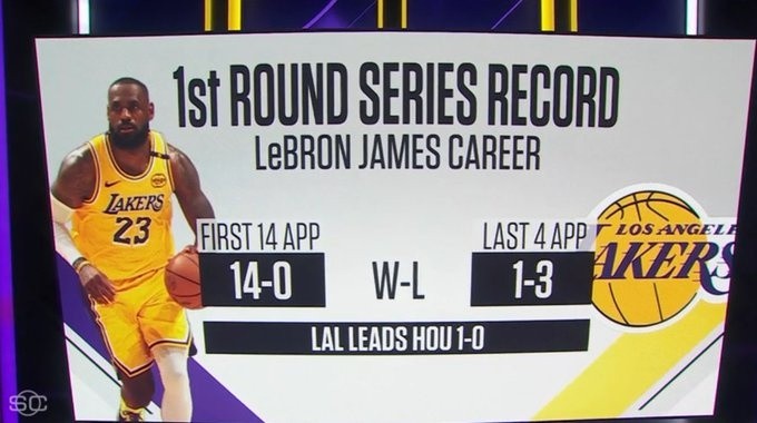 勒布朗四年季后赛首轮胜场统计:一胜三负,生涯十四次全胜战绩
